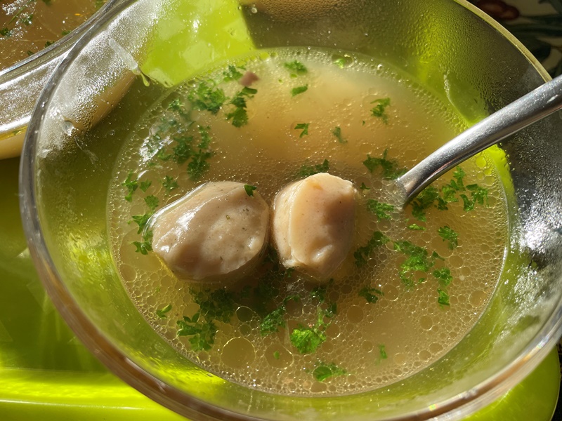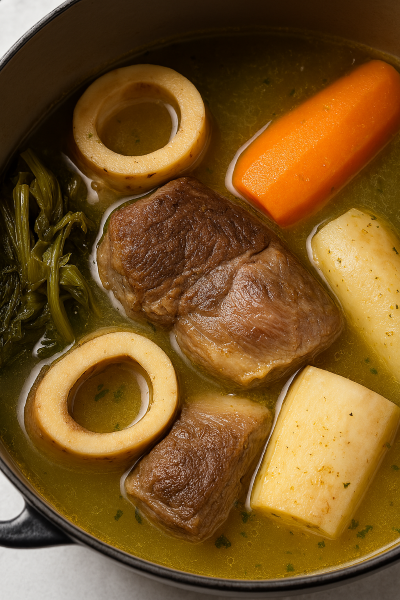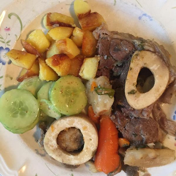 - Anschließend das Gemüse (außer den Kartoffeln) sowie die Markknochen hinzufügen und 1 Stunde lang weiterkochen lassen.